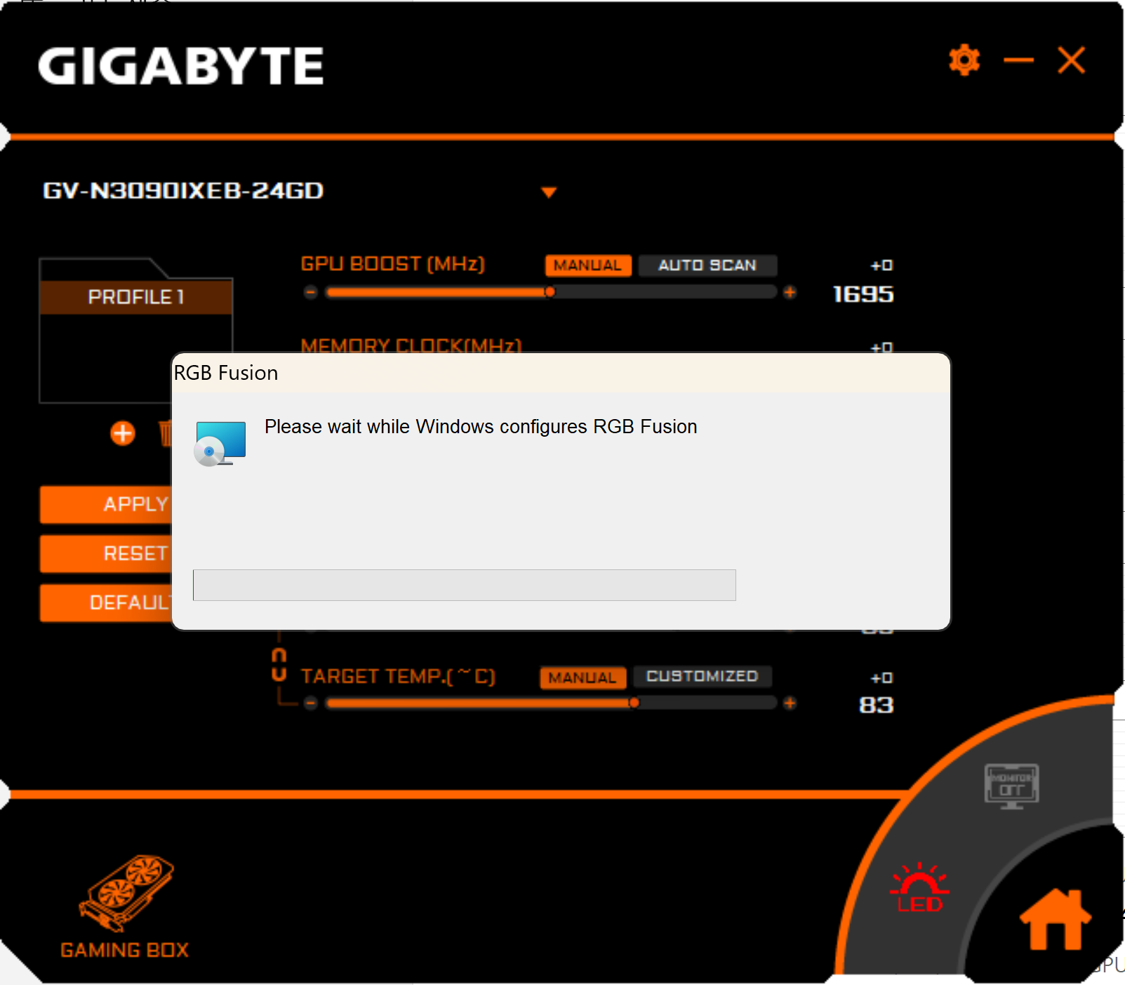 eGPU LED 가 안켜진다. 고장난 것인지 하다가 RGB Fusion을 실행하면 프로그램이 반응이 없다.