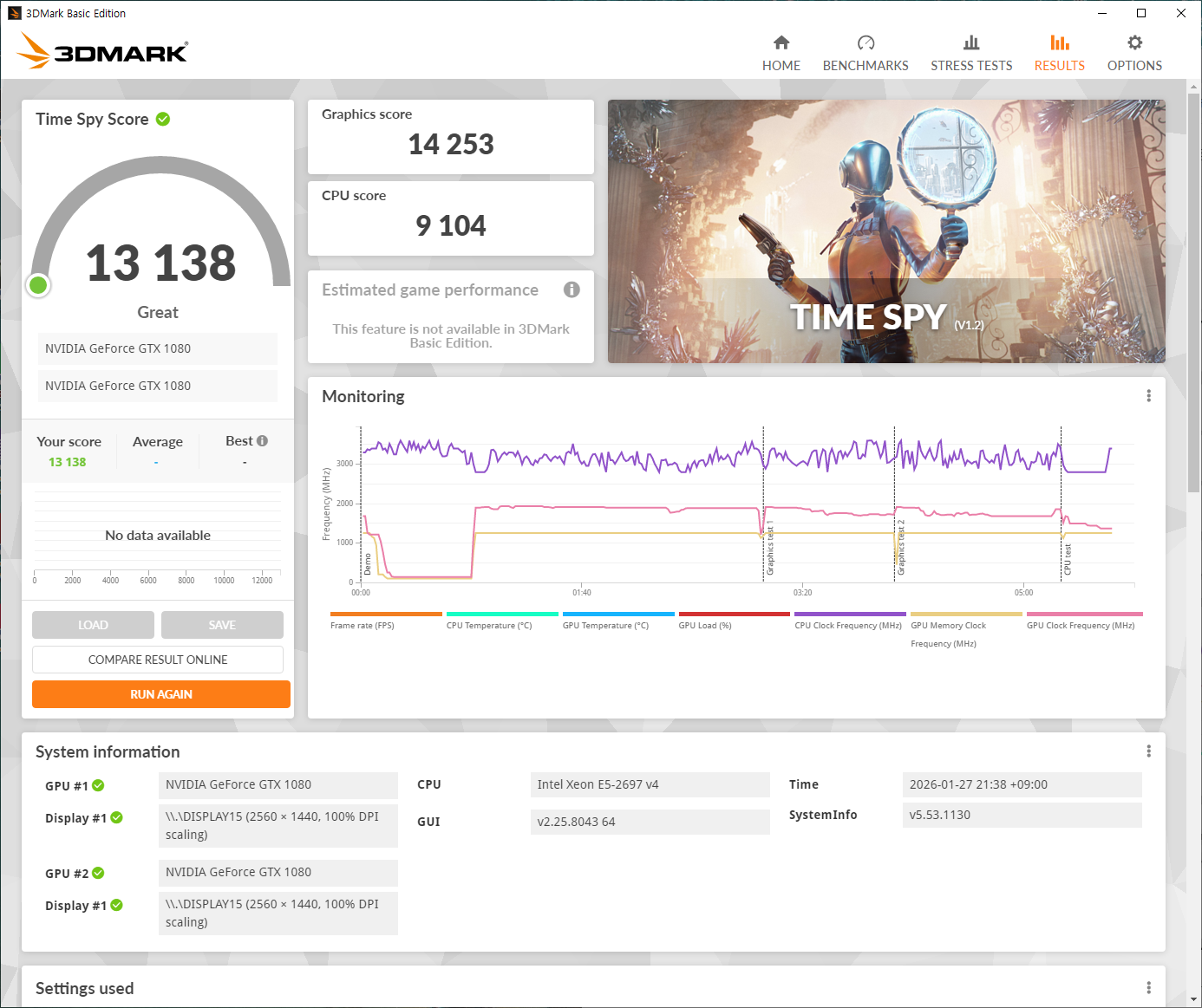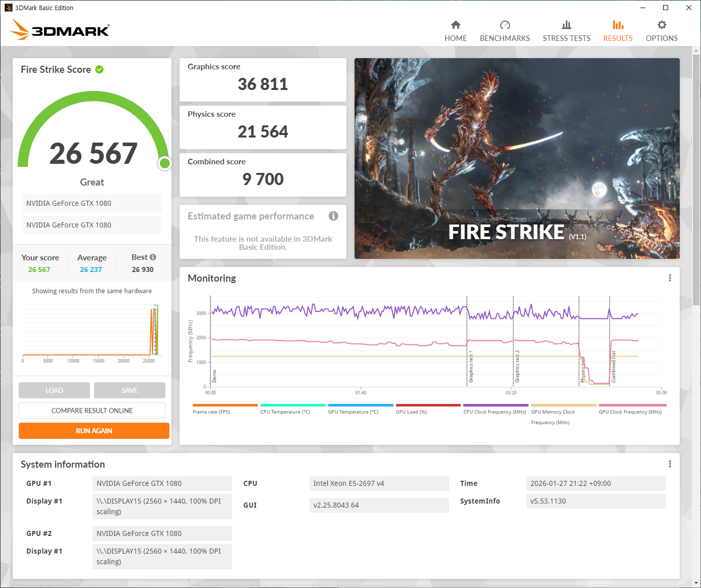 [PC] 3DMARK: 26567, 13138 @GTX1080 x2 SLI, E5-2697V4 본문